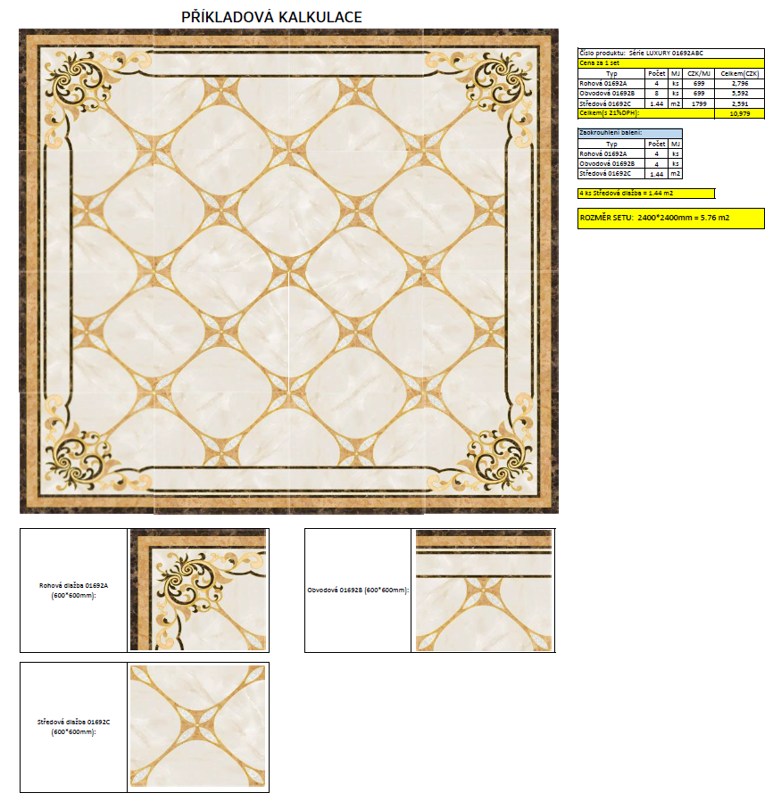 Jedná se o velice kvalitní a luxusní mikrokrystalické keramické dlaždice. Mikrokrystalický kámen se v linii rovněž nazývá mikrokrystalická skleněná keramická kompozitní deska. Jedná se o high-tech produkt, který kombinuje vrstvu 3-5 mm mikrokrystalického skla a kompletně ji integruje po sekundárním slinování. Při výrobě byl použit vysoce kvalitní práškový pigment pro dokonalé a dlouhotrvající barvy a titan pro lepší efekt pozlacení a postříbření s odolností proti poškrábání. Jednodušeji řečeno, dlažba se skládá z keramického podkladu, vrstvy designového návrhu - tištěný pigment a mikrokrystalického skla. Design dlažby je originální, vytvářený za naší spolupráce na zakázku, speciálně pro naši společnost. Minimální počet k objednání jsou 4 ks.