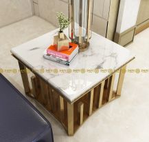 Designový odkládací stolek - ideální do obývacího pokoje k sedací soupravě. Vyroben z nerezové oceli v kombinaci s titanem, zlatá barva je docílena galvanizací, vrchní deska je pak z přírodního kamene a povrch je zalit pryskyřicí pro větší odolnost a vyšší lesk, rám konstrukce je vykládán perletí z mořských lastur, rozměr 70x70x50 cm. Možnost výběru kamenných desek dle aktuálních vzorníků.